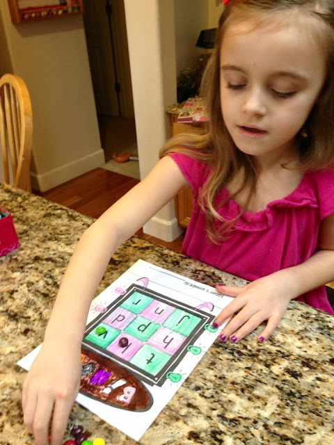 Another great hands on feature of this program is the homemade games. They are included as black and white templates in the student activity book. Certain lessons will say to pull out the game page, and I will have Joelle color the pieces. Then I laminate them. So far we have three or four games, all working on reviewing various words or sounds. She loves these games, especially because she has helped with creating them. So far we are on lesson 14, and we have taken a day just to review by playing games (before going on to the next lesson) a total of four times. I really like the flexibility of this program. We can see progress very easily. But, the times that I've felt she needed to slow down, we were able to do so without any problems. The games allow for continuous review.